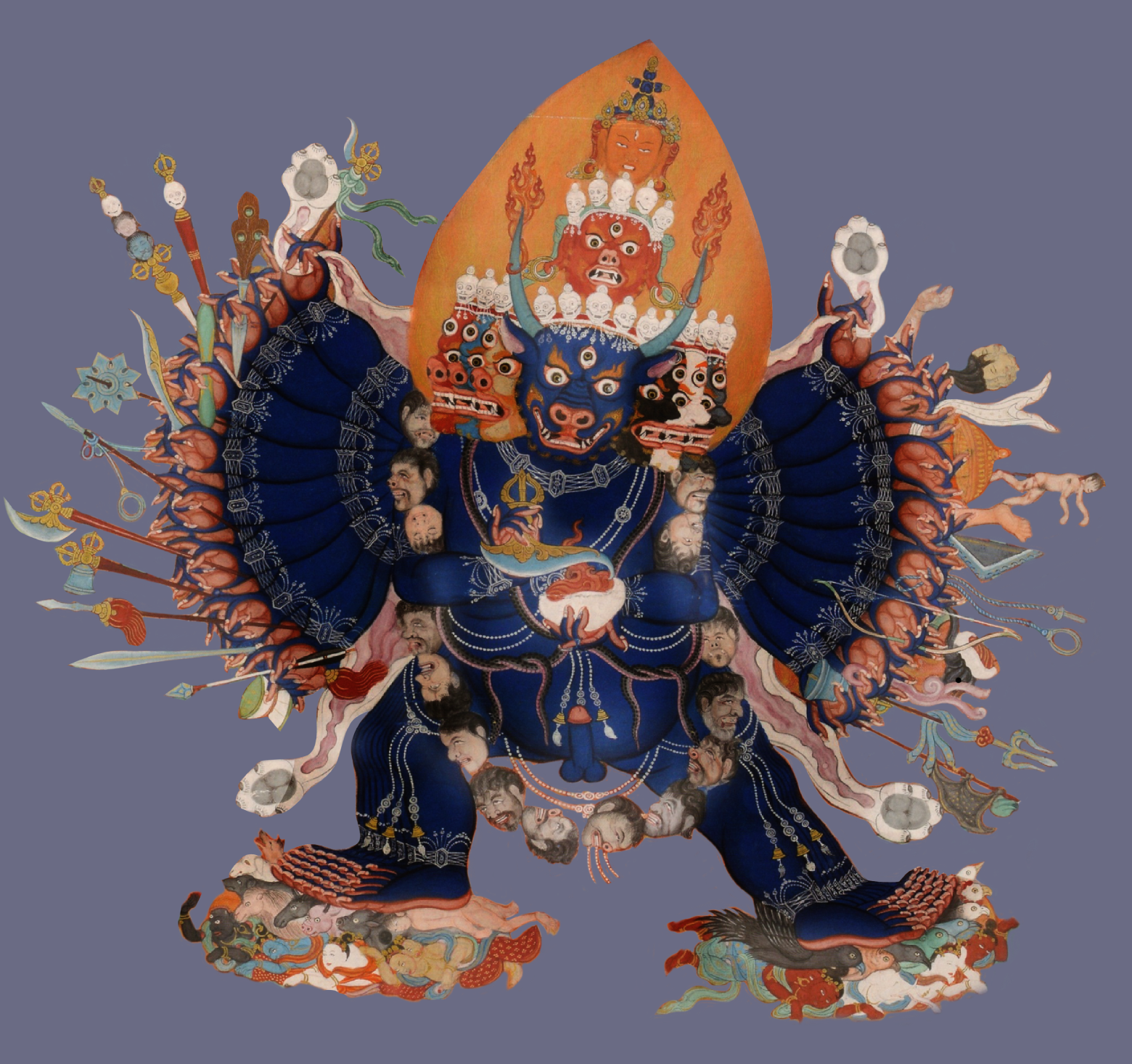 У вас должен быть очень ясный образ себя в качестве Ямантаки. Ваше иссиня-чёрное тело огромно, как гора (или оно другого размера, если вашему уму так удобнее). У главного лика и шести боковых общая кожа и общая шея. Боковые головы подобны пузырькам на главной. Лик людоеда, расположенный над главным, красного цвета и сидит на собственной шее, растущей из затылка главной головы. Ещё выше находится голова Манджушри, также с собственной шеей. (В соответствии с объяснением Джампы Шейнмана, лик азиатского буйвола – это символ трансформации тупости, так как буйвол – чрезвычайно тупое животное.) В разных переводах способы визуализации ликов несколько различаются. Лама Цонкапа исследовал этот вопрос и нашёл наставление, которое Лалитаваджре по этому поводу дала супруга Ямантаки: Тридцать четыре руки расположены четырьмя группами по восемь (спереди слева, сзади слева, спереди справа и сзади справа), и ещё две руки сверху. Восемь правых ног подогнуты, а восемь левых – вытянуты. Расстояние между правыми и левыми ступнями равняется пяти пядям. Ступни попирают Индру и Брахму, о которых говорится, что это два самых могущественных существа во вселенной. И раз уж эти существа подчинены, то об остальных и говорить не приходится. Это значит, что Ямантака покорил всех существ вселенной – он способен поглотить три мира. Главный (буйвольский) лик издаёт угрожающий смех «ХА-ХА», смех счастья «ХЕ-ХЕ», гордый смех «ХИ-ХИ» и всезатмевающий смех «ХО-ХО». Все эти восемь слогов являются смехом Героя. Эти виды смеха были описаны Нагпо, Чёрным Святым. Итак, всего есть восемь гневных ликов и один мирный. Каждый из восьми языков молниеносно движется вперёд-назад между белоснежными клыками. У переносицы и на лбу видны морщины гнева. Глаза и брови подобны огню конца кальпы, жёлто-коричневые волосы стоят дыбом. Левые руки сложены в устрашающую мудру, наводя ужас на всех мирских демонов, чинителей препятствий и других злых существ. Правые руки также сложены мудрой устрашения, но повёрнуты немного вверх (левые руки повёрнуты немного вниз). Повёрнутые кверху правые руки – это просьба ко всем Буддам и Бодхисаттвам о быстром даровании сиддх чувствующим существам, а левые руки устрашают мирских существ, чтобы те прекратили свои вредоносные действия по отношению к практикующим.